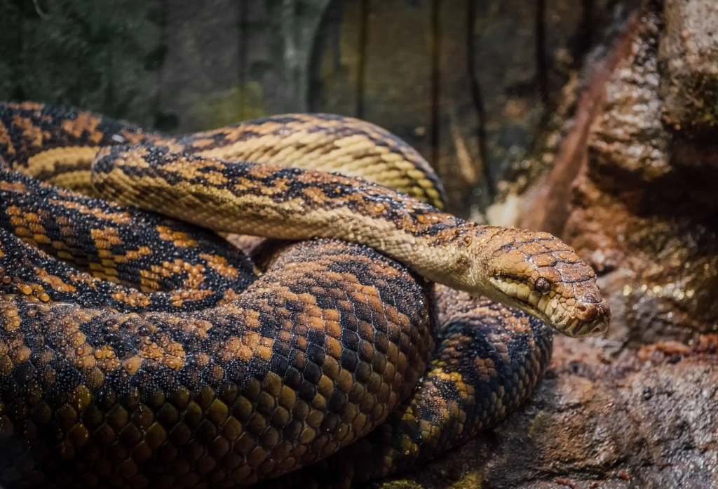 Reticulated pythons are easily recognized by their intricate mosaic pattern of yellow, brown, and black diamonds, forming a “net” that provides excellent camouflage among leaves and shadows.