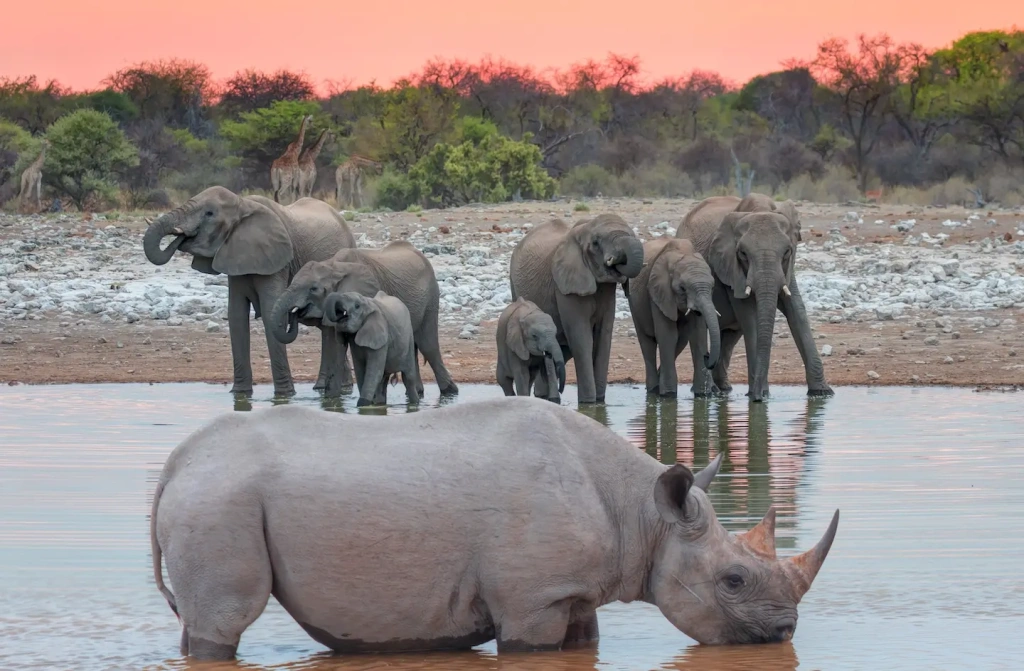 In most African parks, visitors must drive through the savanna searching for animals hidden in vegetation. In Etosha, wildlife viewing is often simpler: you take a position near a waterhole and wait. This allows for close observation of elephants, black rhinos, and other inhabitants of the park’s arid savanna.